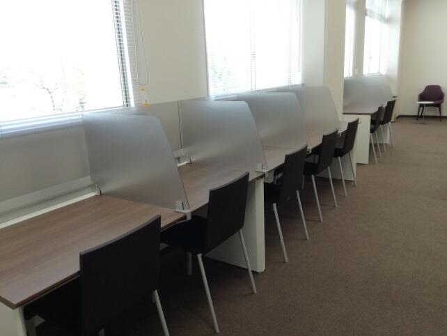 室内中央には複数人で自習できる丸机、窓際には1人で自習するのに適した机、新着雑誌書架の近く